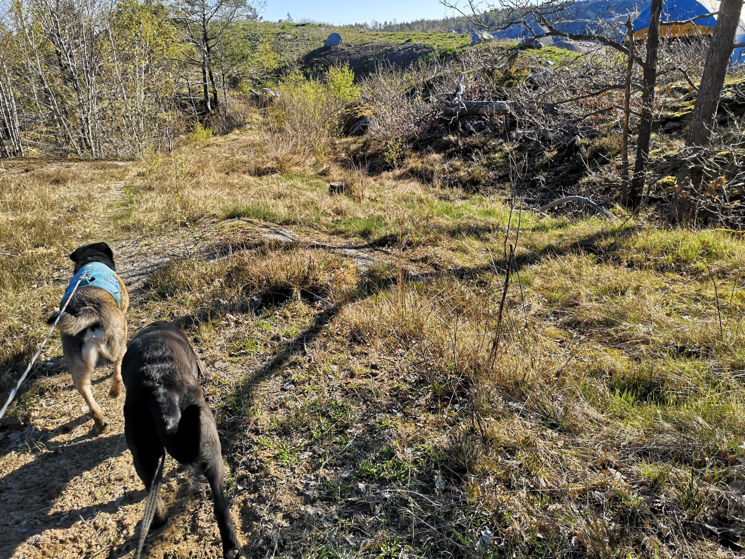 Till slut hade jag tråcklat mig förbi den gigantiska bergtäkten med båda hundarna i koppel medan jag snubblade fram och försökte hitta en väg som inte var alltför brant. När vi kom på kanten av grustaget låg… en liten myr. Vid det laget var jag riktigt irriterad på att leden var så dåligt markerad och plumsade bara rakt igenom åt det håll jag visste att leden låg – utan att bry mig om ifall jag blev blöt om fötterna. Till slut kom vi in på den och fick följa längsmed stängslet på utsidan av bergtäkten. Jag mätte inte hur lång bit vi gick längs med Alekrossen, men en alldeles för stor del av de 6 km leden är skulle jag vilja säga. Totalt själsdödande!