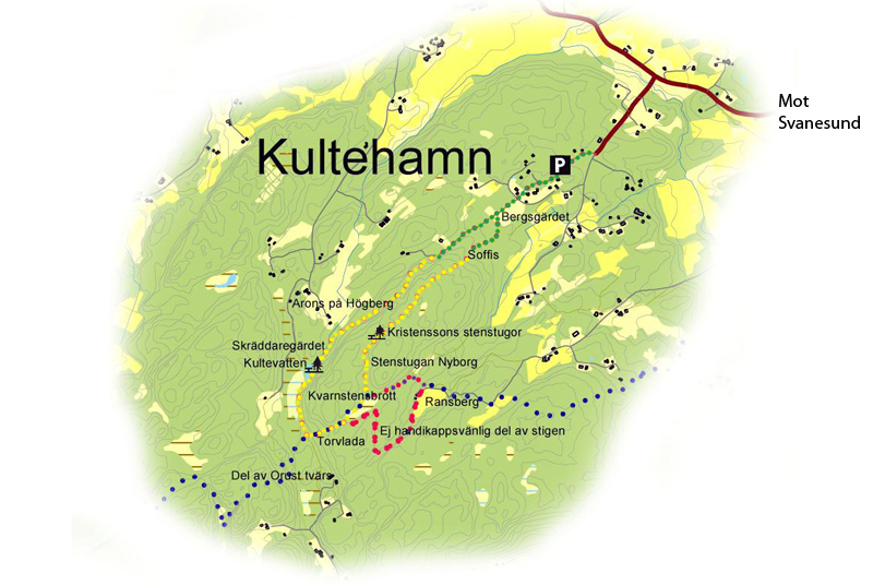 På kartan kan du se hur tillgängligt det är på en tregradig skala grön, gul och röd. Grönt är fullt tillgängligt för alla medan gult är tillgängligt för många men kan innebära problem för några. Rött är otillgängligt för rullstolsburna men ändå ganska lättvandrat. Blått markerar anslutning till Kuststigen, delsträckan Orust Tvärs. Kartan kommer från Orust kommuns information om Kultehamn.