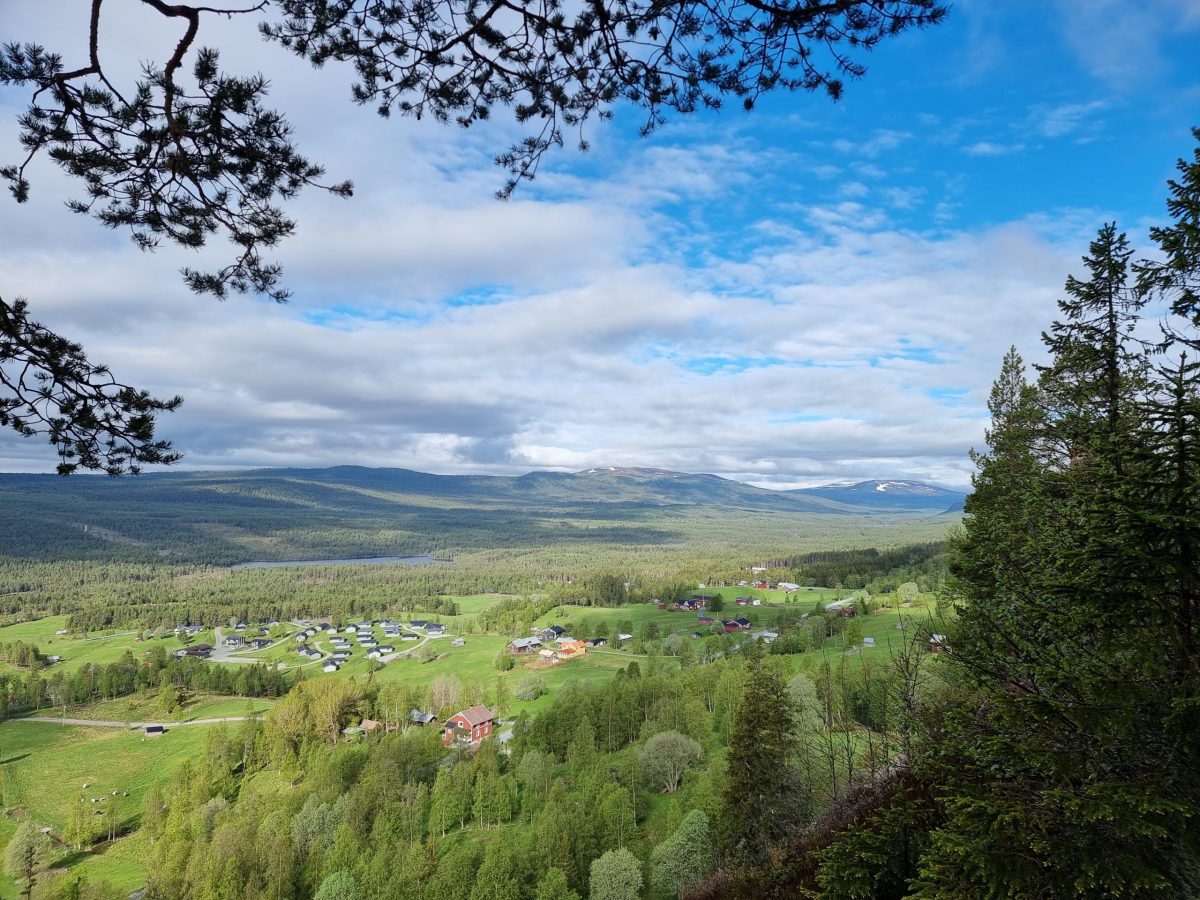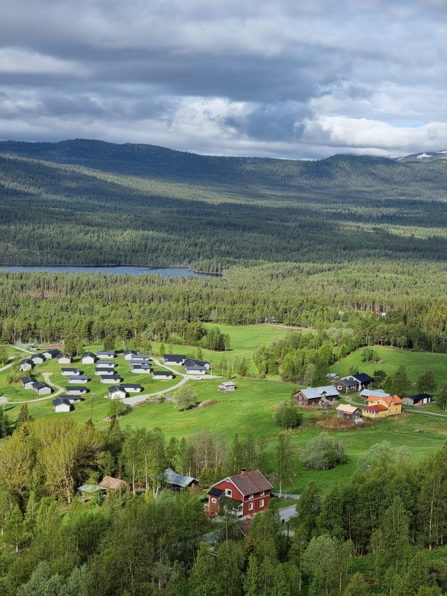 När vi kom fram till den stora utsiktplatsen, som dessutom är försedd med skyddsstaket, stannade vi en stund. Rakt under mig såg jag kyrkan nere i Tännäs, och terrassodlingarna runt samhället bredde ut sig. Dessutom såg jag även ner till Fjällbyn där familjen fortfarande låg och sov i stugan.